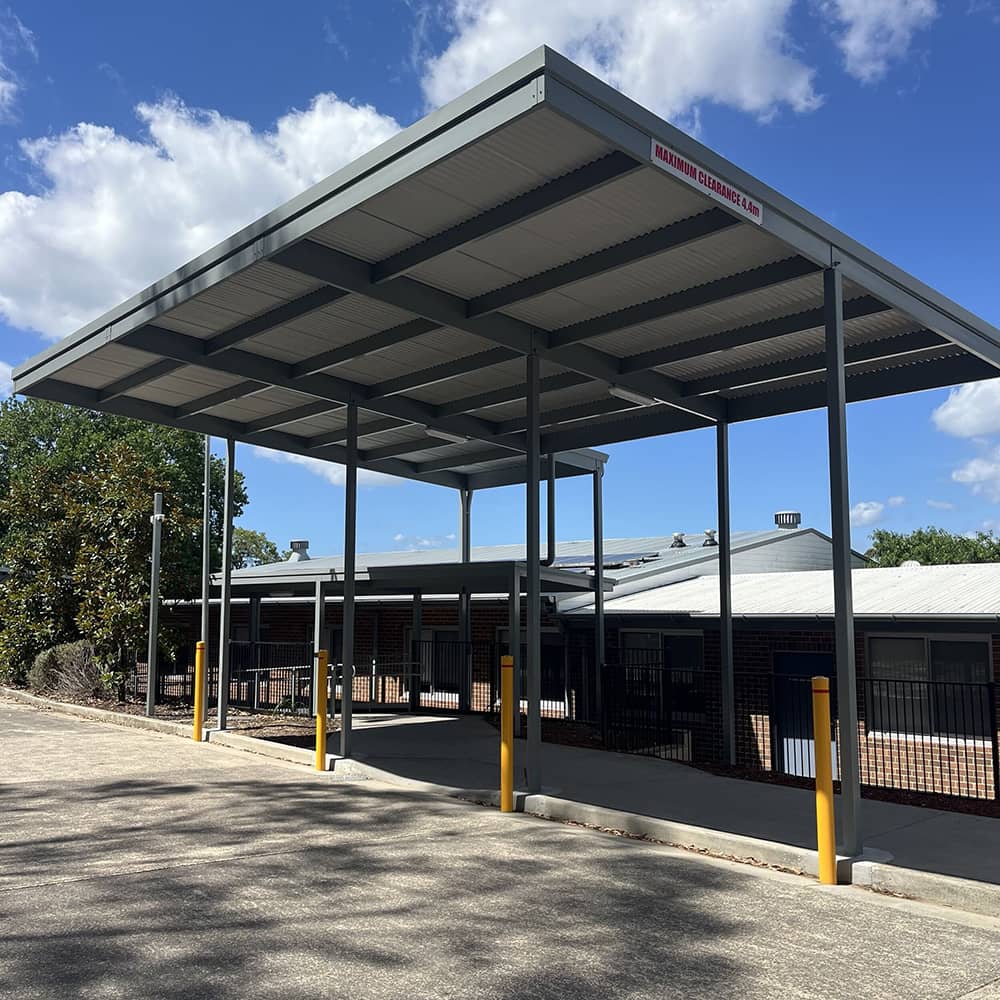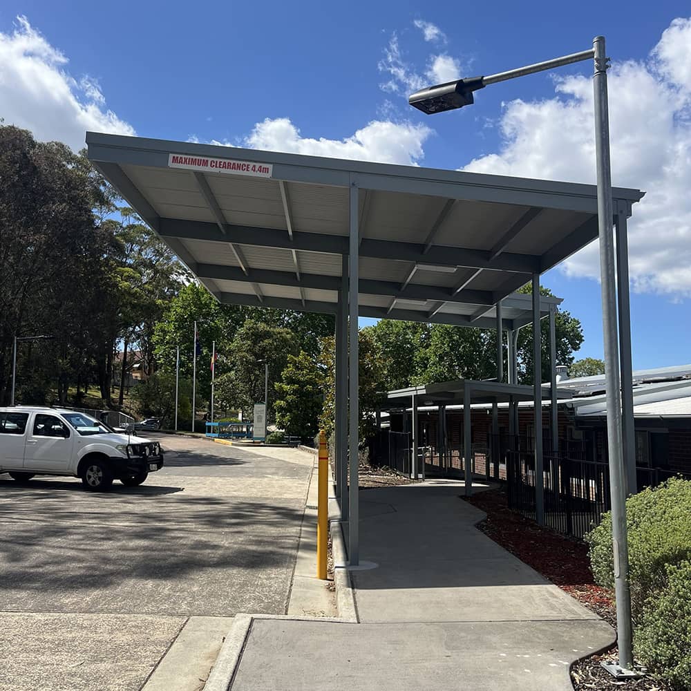 Cardiff High School required a new covered solution for its assisted transport drop-off area, along with a protected pedestrian link to the administration block and central courtyard. While a footpath existed, there was no overhead shelter, leaving students, including those in wheelchairs, exposed to weather during arrival and departure. The brief was to design and construct a cantilevered shelter over the designated drop-off zone and deliver a connected covered walkway. Safety, accessibility, durability and compliance were critical priorities. The structure needed to accommodate bus and truck height clearances, integrate tactile indicators and bollards and compliment the school’s main street frontage. Complicating factors included working around an existing ramp with a drop edge on one side, managing live drop-off and pick-up times with careful staging, building in the school’s street frontage without impacting daily operations and ensuring zero disruption due to the HSC examination period.
